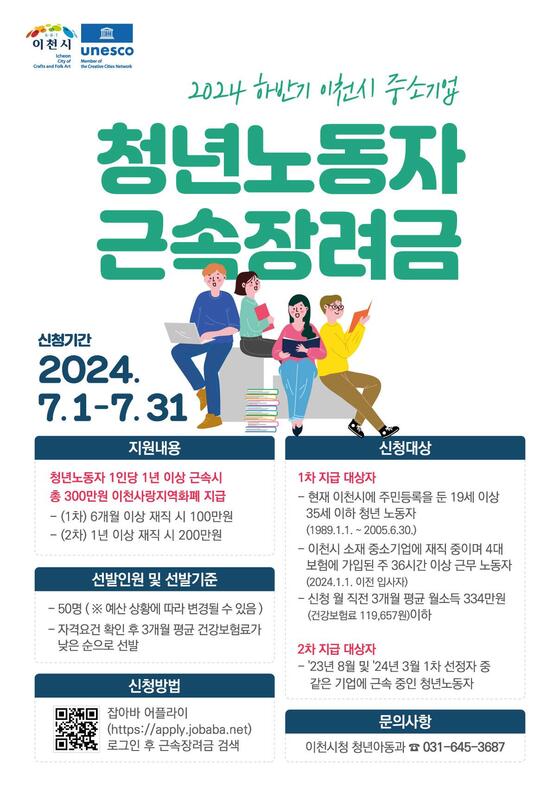 이천시(시장 김경희)는 『2024년 하반기 이천시 중소기업 청년노동자 근속장려금 지원사업』 참여자를 오는 7월 1일부터 7월 31일까지 모집한다고 밝혔다.
