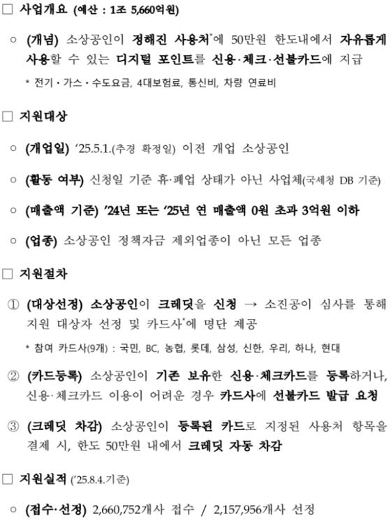 ![]() ▲ 소상공인 부담경감 크레딧 지원사업 개요(자료=중소벤처기업부) © |