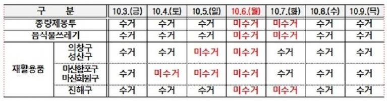 재활용품 수거 일정은 구별로 다르게 운영된다. ▲의창·성산구는 10월 5일~6일 2일간, ▲마산합포구·회원구는 4일~6일 3일간, 진해구는 6일~7일 2일간 수거가 중단된다. 이외 연휴 기간에는 평소와 동일하게 수거가 진행되므로, 시민들은 반드시 구별 수거 일정을 사전에 확인 후 배출해야 한다.